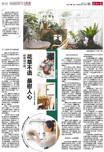 “植物不言说,却最诚实”,这是刘璐工作室墙上挂着的一句标语。“和一些钢筋水泥等材料不同,植物很难完全按照你的想法去生长,你怎么对待它们,它们就会以最真实的姿态展现在你的面前。”刘璐说,每一次设计都像是一场与生命之间的对话。花草不语,却总能给人持久的陪伴。