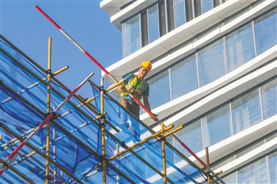 近日,在三亚中交国际自贸中心总部项目施工现场,工人在拼装脚手架。