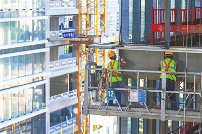 近日,工人们在三亚中交国际自贸中心总部项目现场安装幕墙。