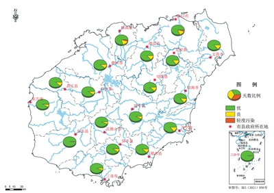 全省环境空气质量总体优良,优良天数比例为99.4%,其中优级天数比例为89.1%,良级天数比例为10.3%,轻度污染天数比例为0.6%,无中度及以上污染天。与去年同期相比,全省优良天数比例下降0.6个百分点,优级天数比例下降10.4个百分点。19个市县中,临高、海口、琼海、东方等4个市县受O3影响分别出现1~4天轻度污染,优良天数比例范围为95.3%~98.9%;其余15个市县优良天数比例均为100%。