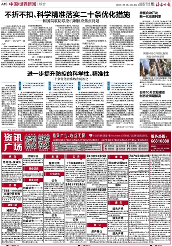 二十条优化措施发布以来,各地结合自身实际,在隔离转运、核酸检测、人员流动、医疗服务等方面采取更为精准的措施。一些地方也在及时纠正与第九版防控方案和二十条优化措施不相符的做法,进一步提高疫情防控的科学性、精准性、有效性。