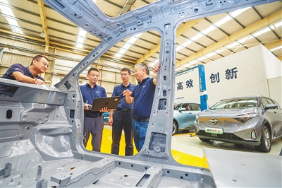 海马汽车海口基地,工作人员正在讨论新能源车升级方案。 本报记者 袁琛 摄