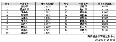 按照《地表水环境质量标准》(GB3838-2002)、《地表水环境质量评价办法(试行)》(环办〔2011〕22号)和《城市地表水环境质量排名技术规定(试行)》(环办监测〔2017〕51号)等评价,2022年1—10月,全省地表水总体水质为优,监测的193个断面(点位)中:水质优良(Ⅰ~Ⅲ类)断面(点位)占94.4%,劣V类占0.5%。19个市县水环境质量按由好至差排名分别为:三沙市、五指山市、琼中黎族苗族自治县、万宁市、保亭黎族苗族自治县、澄迈县、白沙黎族自治县、昌江黎族自治县、陵水黎族自治县、三亚市、琼海市、海口市、乐东黎族自治县、屯昌县、定安县、临高县、儋州市、东方市、文昌市。详见右表: