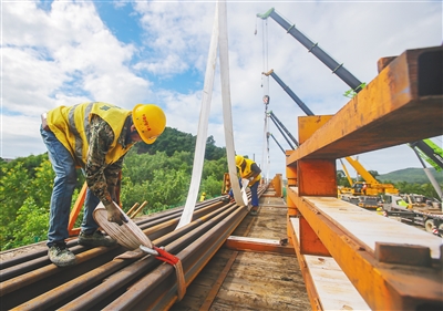在三亚至乐东公交化旅游化铁路改造工程SLZQ-2标段崖州联络线双线特大桥施工现场,吊车挥舞着“手臂”,数十名施工人员忙于架梁施工作业,现场热火朝天。