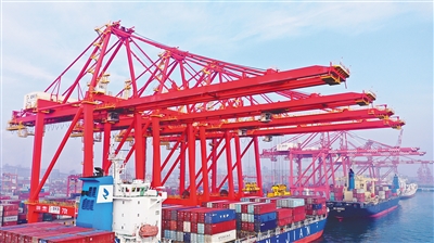 货轮停靠在山东港口日照港集装箱码头进行装卸作业。新华社发