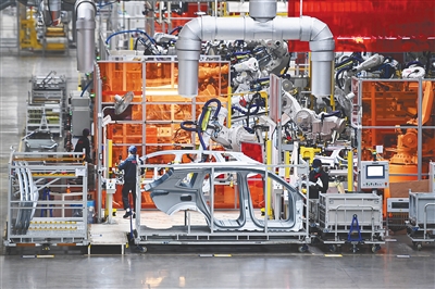 在领克汽车宁波梅山工厂,工人操作自动化焊接线。新华社发