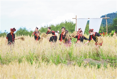以山兰稻田为舞台,以绿水青山为幕布,身穿节日盛装的黎族儿女穿梭在稻田间,手拉手欢唱《捻稻歌》等,欢快的歌声飘扬在群山之间,古老而又淳朴的农耕画面展现于众人眼前,也预示着人与大自然和谐相处、互相依存、共同发展的美好明天。在这一独具民族特色的丰收庆典里,远道而来的宾朋还饶有兴致地体验收割、舂米等黎族传统稻作农事。