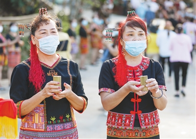 11月27日,在白沙拥处村,黎族村民捧起山兰美酒迎接宾客到来。
