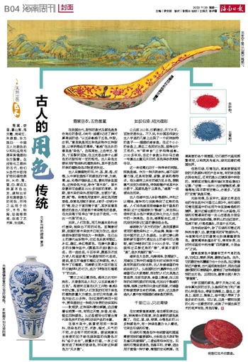 文\本刊特约撰稿 夏冰青黛、窃蓝、暮山紫、海天霞、弗肯红、朱颜酡、东方既白……中国古人对颜色的认知和运用充满审美情趣和东方智慧。在没有化工颜料的古代,他们从自然中取用矿物和植物颜料,从赤、青、黄、白、黑这五种基本色出发,调制出许多充满想象力的间色,并将之运用于纺织、木作、制陶、绘画等领域,创造了艺术美、生活美。