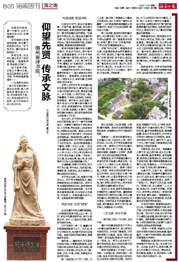 已是初冬时节,琼岛仍温暖如春。天朗气清,惠风和畅,阳光穿过茂密的绿荫,投射在丽泽书院中矗立的一尊花岗岩雕刻成的塑像。“这就是许子伟先生,后人感念他在儋州的功绩,专门在书院立塑像,供世人凭吊纪念。”每次来到丽泽书院,仰望这尊塑像,韩国强总是肃然起敬。
