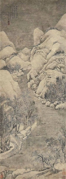 画面上暮色沉沉,雪山皑皑,寒林寂寂,一派粉妆玉砌的江南景色。渔人早归,宿雁低飞,一片静谧。在大雪纷飞的隆冬时节,主人遣童沽酒,江边买鱼,或是家中来友,置酒待客;抑或漫漫冬夜,拥炉自斟。画面结构严谨,苍茫浑厚,山谷中一条溪水从远方流来,蜿蜒曲折,将画面分为左右两个部分,一桥飞架连接两岸。群山逶迤,寒林萧瑟,庙宇、房舍、店铺、渔船穿插其间,错落有致。渔船登门送货,岸边仆从打伞前行,尽管人物很小,但其神情形态具体生动,透露着生活气息,连同奋飞的雁阵为寂静的雪山寒林增添了勃勃生机。