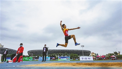 男子成年组跳远决赛中,选手奋力跳出好成绩。 本组图片由本报记者 陈元才 摄