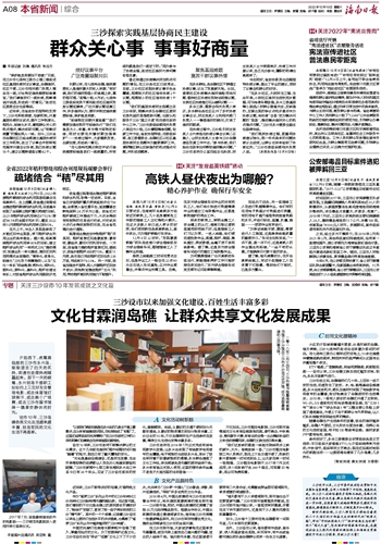 新时代新征程,三沙人将坚定不移地沿着党的二十大指引的方向奋力走好新时代的“赶考之路”,牢记“守好祖国南大门”“保护南海生态环境”两个“国之大者”,坚决维护好国家海洋权益,在建设社会主义现代化国家的新征程上和海南自贸港建设中作出三沙探索、贡献三沙力量!