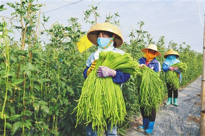 女工们正在摘豇豆。
