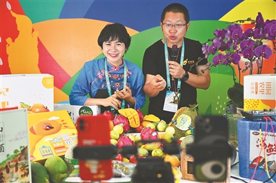 冬交会三亚展台的工作人员在直播销售农产品。新华社记者 郭程 摄