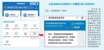 本报海口12月18日讯 (记者马珂)只要一发热咳嗽就是感染了新冠?如果没有做抗原和核酸,怎么判断自己是不是确诊?如果发烧咳嗽,怎样判断是否该前往医院就医呢?这些都是近期不少群众十分关注的问题。海南日报记者了解到,“海南健康岛”微信小程序上线了新功能——新冠就医自测,帮助判断新冠症状轻重,对是否要去医院就医做一个初步的自我评估和排查。据悉,为切实满足市民新冠就医咨询需求,海南省卫健委根据《新冠病毒感染者居家治疗指南》提供诊疗意见,上线“新冠就医自测评估”功能,让市民可居家自行开展新冠肺炎的初步自我评估和排查。
