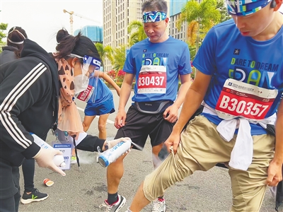 志愿者用喷雾帮助参赛选手缓解疼痛。 本组图片由本报记者 李天平 摄