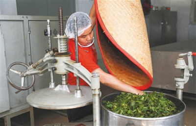 小到合作社,大到茶厂,海南机械化制作茶叶已很普遍。图为五指山市水满乡某茶厂工人将茶青倒入揉捻机加工。