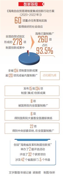 据介绍,《海南自由贸易港制度集成创新行动方案(2020-2022年)》自2020年10月印发实施以来,60项重点任务落地实施,取得良好的社会效益;截至目前,已发布15批134项制度(集成)创新成果,8项被国务院向全国复制推广,6项得到国务院大督查全国通报表扬,22项得到中央部委采纳,在全国复制推广;全国自贸试验区形成的278项制度创新成果中,海南已复制推广260项,占比逾九成。