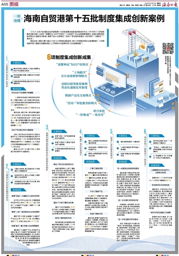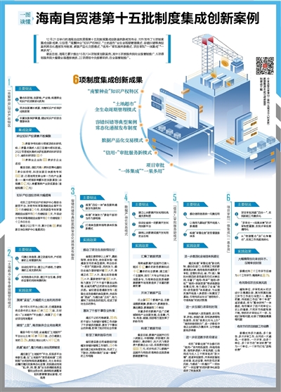 12月21日举行的海南自由贸易港第十五批制度集成创新案例新闻发布会,对外发布了6项制度集成创新成果,分别是:“南繁种业”知识产权特区、“土地超市”全生命周期管理模式、容错纠错等典型案例常态化通报发布制度、数据产品化交易模式、“信用+”审批服务新模式、项目审批“一体集成”“一果多用”。截至目前,海南已累计推出15批134项制度创新案例,其中8项被国务院向全国复制推广,6项得到国务院大督查全国通报表扬,22项得到中央部委采纳,在全国复制推广。