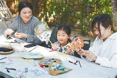 在三亚博后村一家民宿,来自武汉的游客参加三亚国际文博会艺术品手工制作活动。