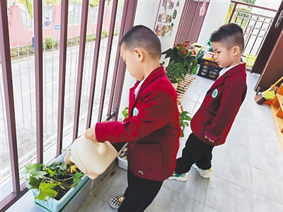 幼儿学习浇灌植物。(图片均由受访单位提供)