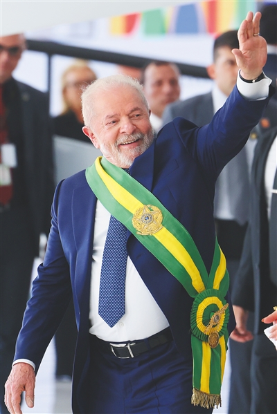 巴西总统卢拉身披象征总统权力的绶带向支持者挥手示意。 新华社发