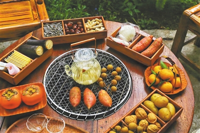时值冬日,哪怕你没尝试过,也多半对围炉煮茶有所耳闻。炉火升腾,铁网烤盘中间摆着一壶茶,外围再摆上一圈栗子、柿子、杂粮……从器物到食物,不仅有暖意,还有古意、诗意,直接把冬天的氛围感拉满。