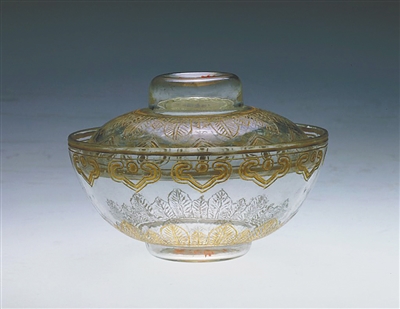 清代无色透明玻璃戗金蕉叶纹盖碗。