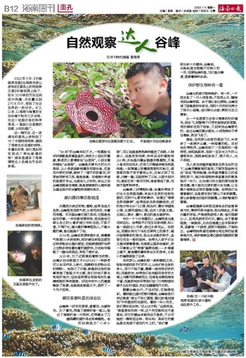 “90后”的谷峰年纪不大,一张圆脸任何时候都是笑意盈盈的,深受大小朋友的喜爱,熟悉的人都尊称他“谷老师”,小朋友喜欢喊他“谷哥哥”。谷峰是天津长大的北方男孩,从小受家庭影响喜欢花草虫鱼,还是在中学的时候,就种了一园子的玫瑰花,时常给同学送几枝,甚是浪漫。在海南大学读的是园艺专业,也是他心之所向,毕业之后谷峰选择留在海南,就是被海南的山海林湖及蕴含其中的丰富物种资源所吸引。