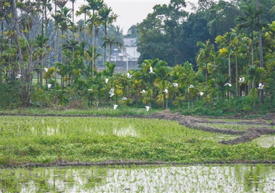 1月7日,在琼海石壁镇大田陂村,绿树葱茏,碧水环绕,鹭鸟或翩翩起舞或在田地里休憩。