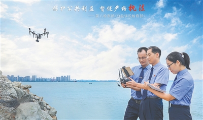 检察干警运用无人机对海洋生态环境污染案件进行调查取证。(省检察院供图)