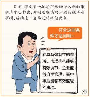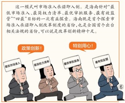 部分事项“取消许可和审批”,对企业来说,是极振奋人心的消息。企业投资经营,多苦于审批材料多、环节多、时间长。承诺即入制在海南落地,无须许可和审批,只需承诺备案,即可投资经营,无疑为企业准入打开了方便之门,是优化营商环境的一大创新。