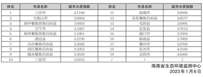 按照《地表水环境质量标准》(GB3838-2002)、《地表水环境质量评价办法(试行)》(环办〔2011〕22号)和《城市地表水环境质量排名技术规定(试行)》(环办监测〔2017〕51号)等评价,2022年1—12月,全省地表水总体水质为优,监测的193个断面(点位)中:水质优良(Ⅰ~Ⅲ类)断面(点位)占94.9%,劣V类占0.5%。19个市县水环境质量按由好至差排名分别为:三沙市、五指山市、琼中黎族苗族自治县、万宁市、保亭黎族苗族自治县、澄迈县、白沙黎族自治县、昌江黎族自治县、陵水黎族自治县、三亚市、琼海市、乐东黎族自治县、屯昌县、定安县、海口市、临高县、儋州市、东方市、文昌市。详见右表: