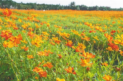 琼海博鳌镇朝烈村一片占地约130亩的田洋里,格桑花和金盏菊等花卉争相绽放。本报记者 宋国强 摄