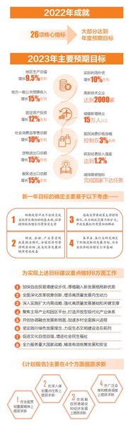 关于2023年主要目标,《计划报告》明确,地区生产总值增长9.5%左右、地方一般公共预算收入增长15%左右、固定资产投资增长12%左右、社会消费品零售总额增长10%左右、城镇新增就业15万人以上、城镇调查失业率控制在5.5%左右、城乡居民收入分别增长9.0%左右和9.5%左右、居民消费价格涨幅控制在3%左右、主要污染物减排和碳排放强度下降,完成国家下达任务。