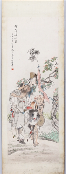 沈心海画的这幅《钟进士嫁妹图》中,鬓边簪花的钟馗牵着毛驴,驴上坐着出嫁的妹妹,一旁跟着护卫的差人,满面春风,一路敲锣,喜气洋洋送嫁。其妹所嫁乃生前资助钟馗赶考,并为其入葬的义兄杜平,结婚之日正是除夕。