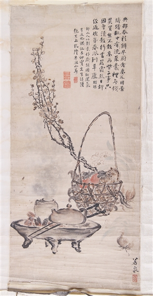 这幅图中绘有藤篮,篮内有梅花、水仙、柿子、菱角、佛手等鲜果花卉,旁边火盆上的茶壶正咕噜噜冒着热气,一旁还有火钳。这就像一张历史照片,展现了古人迎接农历新年的一幕场景。在迎接春节的爆竹声里,家宅洒扫一新,藤篮里装满果蔬。人们煮一壶清茗,等候亲人、乡邻、师友前来拜年。藤篮清供中,佛手,取神灵庇佑之意;水仙,为时令鲜花,做阖家团圆之盼;柿子,寓意祈盼日子红红火火、事事如意;梅花,立清高自守之志;茶壶、火炉等物品,则有“一壶清茶许流年”“得享清福”的意味。