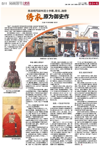 有明一代,海南岛仅琼山县(今海口市)便出了李珊、陈实、海澄三位“绣衣御史”,有过三座绣衣坊,“海外衣冠盛事”之说,果然名不虚传。