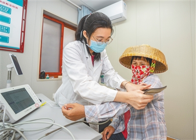 在琼海沙美村卫生室5G诊室,全科医生用“健康一体机”为村民检查身体。本报记者 袁琛 摄