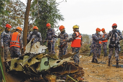 1月16日,救援人员在尼泊尔博克拉地区坠机现场工作。