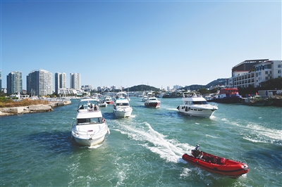 1月19日,三亚湾畔,游客乘坐游艇感受乘风破浪的惬意。