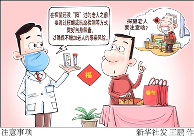 答:在探望还没“阳”过的老人之前,要通过核酸或抗原检测等方式做好自身筛查,以确保不增加老人的感染风险。