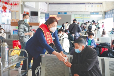 1月26日,在海口秀英港码头,工作人员为返程旅客送上热姜茶。 本报记者 韦茂金 摄