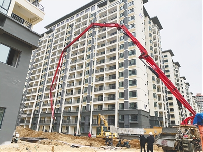 近日,在东方滨海片区(一期)棚户区改造安置房项目现场,工人对小区道路进行混凝土浇筑。 本报记者 张文君 摄