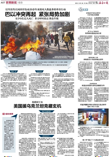自以色列去年春季在约旦河西岸多地发起“夜间袭击”,以军和巴勒斯坦人的冲突开始激化。内塔尼亚胡去年12月重掌政权,在巴以问题上立场更加强硬,促使冲突进一步升级。包雪琳(新华社专特稿)