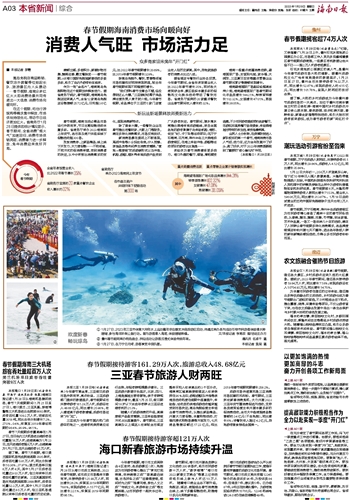 春节期间,海口市开展各类群众文化活动200余场次,吸引市民游客数十万人次,“数字海博”“海口市2023新春文艺晚会”等掌上过年活动吸引线上参与人次达10万人次。 随着海口商业业态不断升级,免税店、酒店、商超结合春节消费推出线上、线下多重促销活动,助推海口多元化购物新体验。