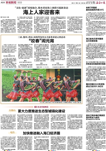本报讯 (记者高懿 陈子仪 曹马志 徐慧玲 通讯员林晓云)2月4日和2月5日将分别迎来立春节气和正月十五元宵节,两个节令紧相连,可谓喜上加喜。各市县举办一系列精彩庆祝活动,诚邀广大市民游客共度喜悦、难忘的元宵佳节。三亚