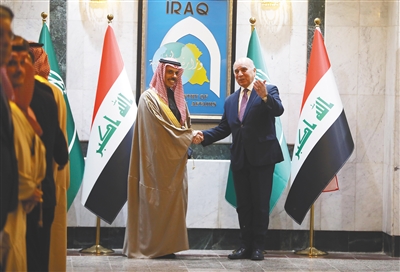 伊拉克总统拉希德、总理苏丹尼2日在巴格达分别会见到访的沙特外交大臣费萨尔,强调要推进两国关系发展,加强协调以缓和地区紧张局势。当日,伊拉克外交部长侯赛因与费萨尔举行会谈并举行联合记者会。新华社发(哈利勒·达伍德摄)