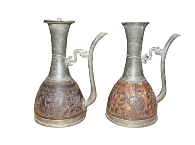 清代暗八仙纹锡胆椰雕酒壶一对。